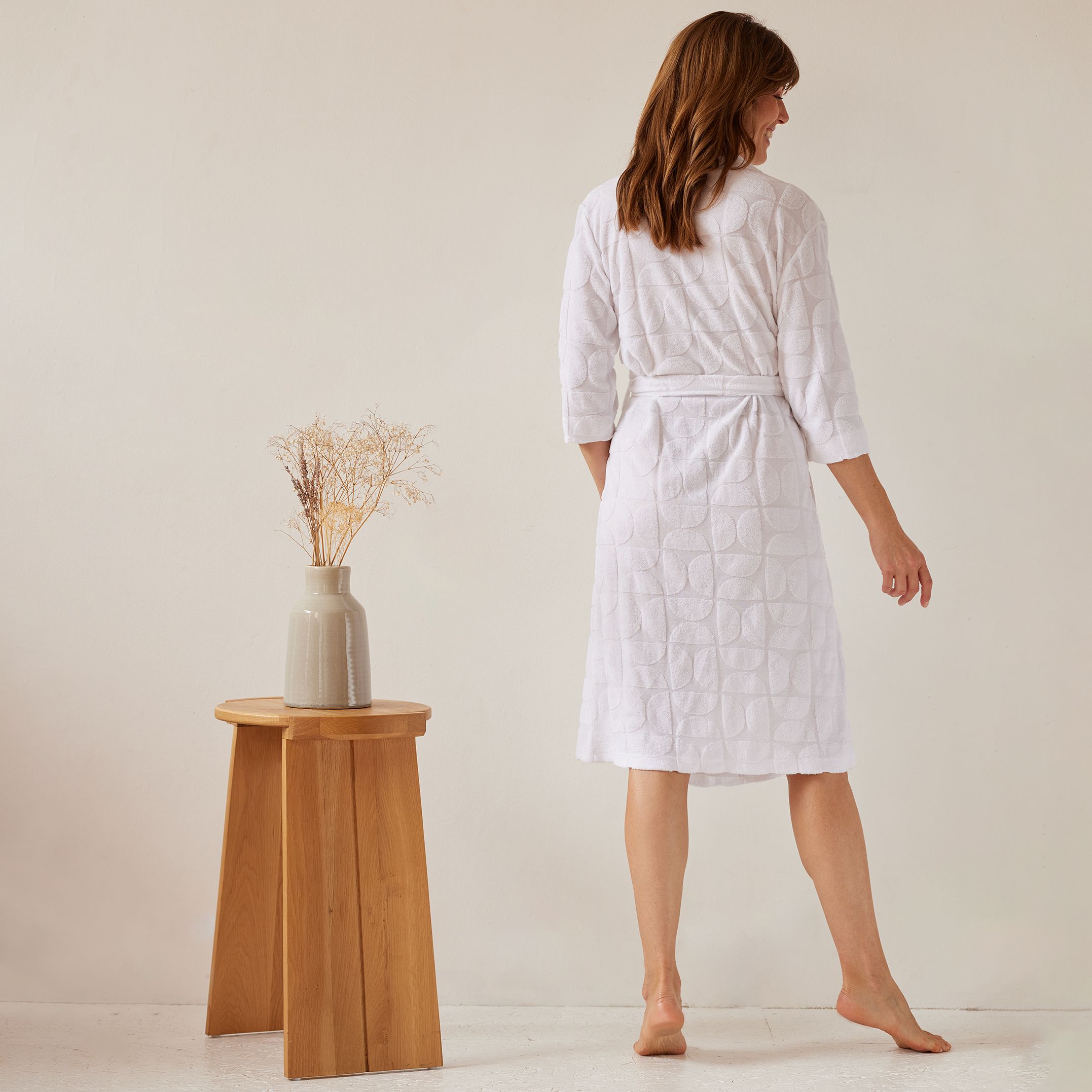 Een kamerjas van Canat. Deze zomerse kamerjas is heerlijk om te dragen, in een zachte terry katoen. Overslagmodel met riem, op knielengte.