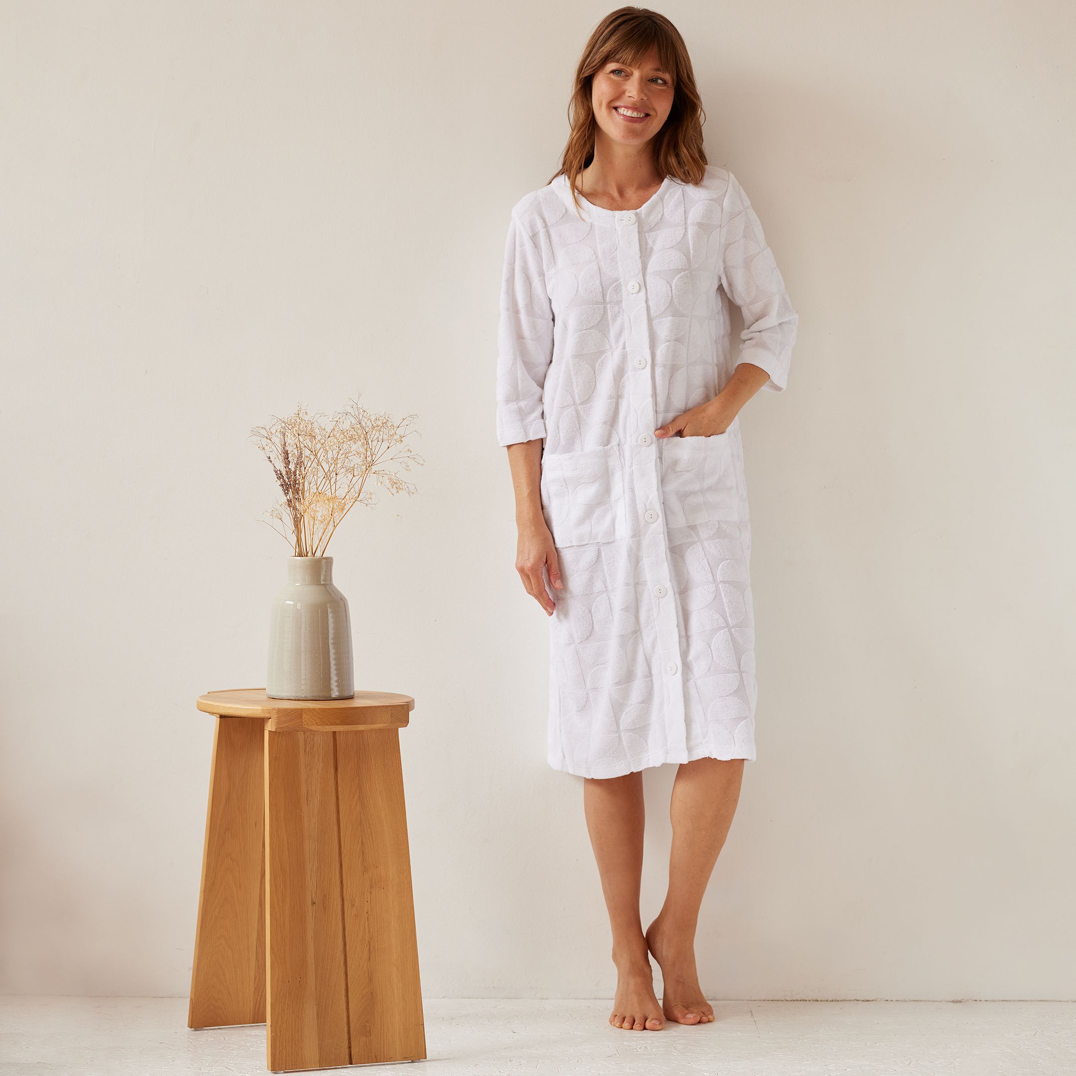 Een kamerjas van Canat. Deze zomerse kamerjas is heerlijk om te dragen, in een zachte terry katoen. Model met knopen vooraan, op knielengte.