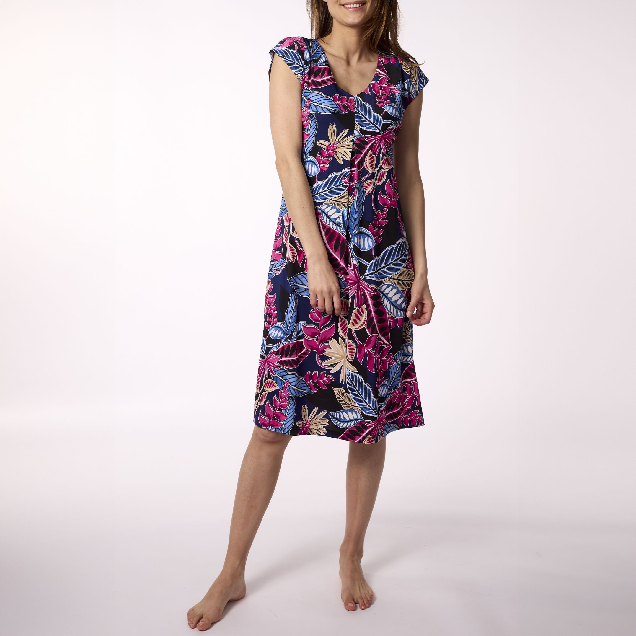 Een zomerkleedje van Canat. Een jurkje op knielengte, met een kapmouw.