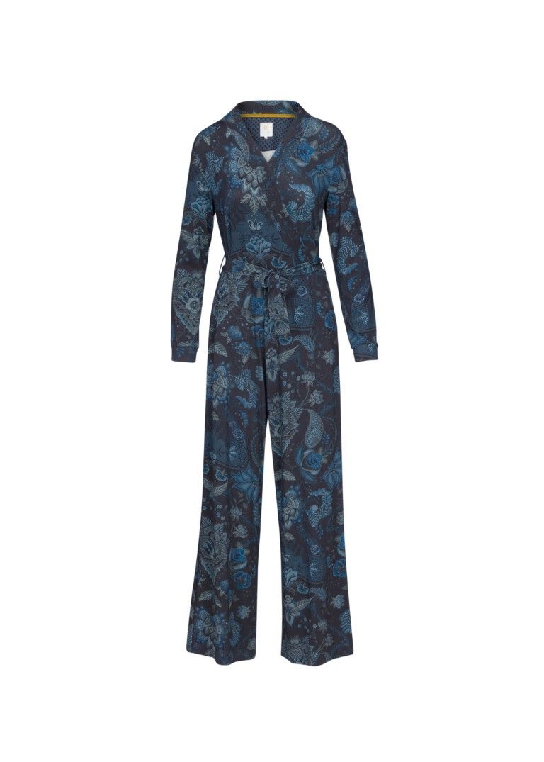 Deze jumpsuit van PiP Studio in het donkerblauw is uitgevoerd met het vrolijke Kyoto Festival dessin. Het herhaalde bloemdessin is opgebouwd uit een variatie van fantasierijke chintz bloemen en bladeren.