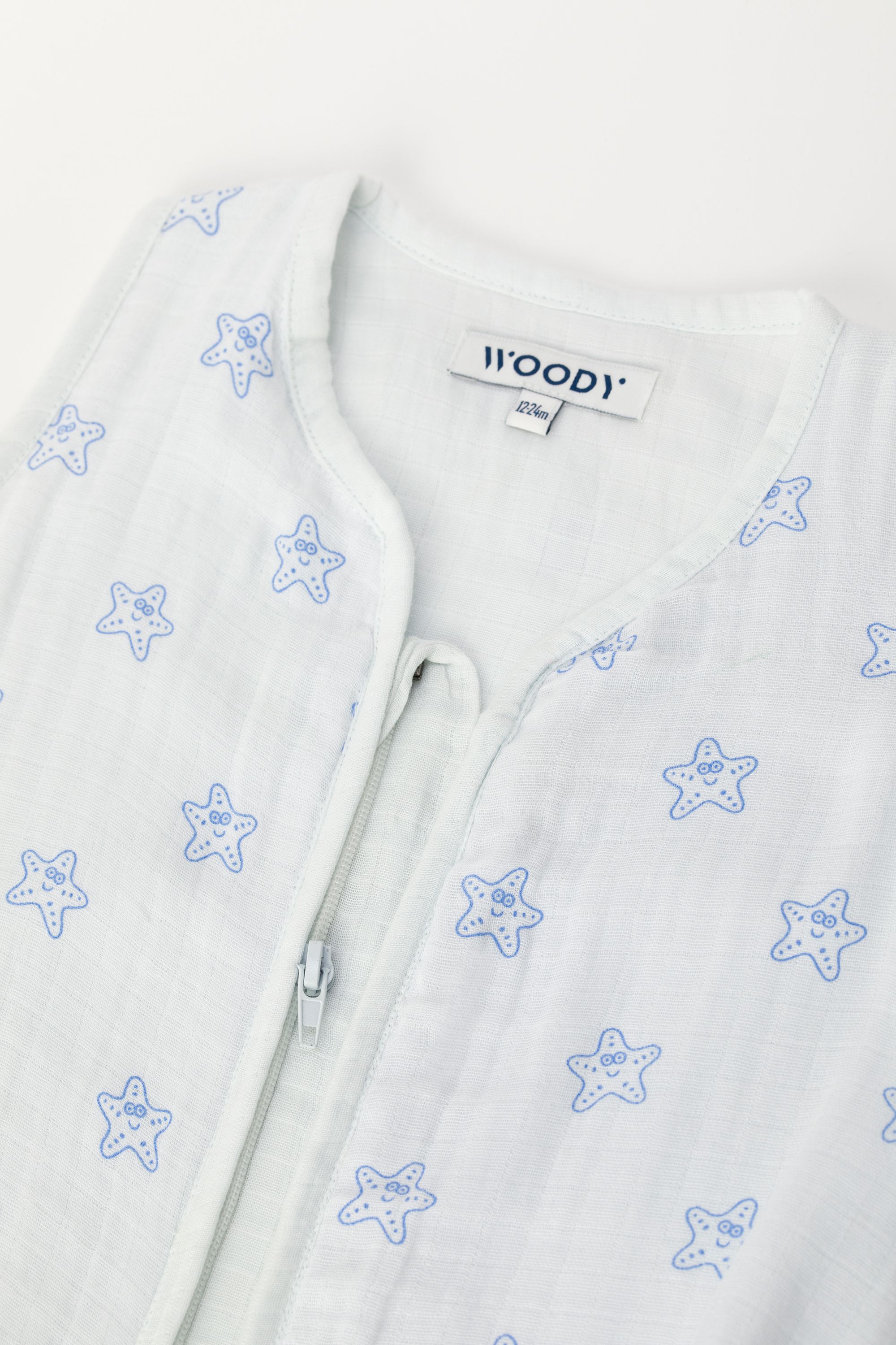 Een mooie slaapzak van Woody, met rits en zonder mouwen, in een zachte tetra katoen. Voor een fijne nachtrust.