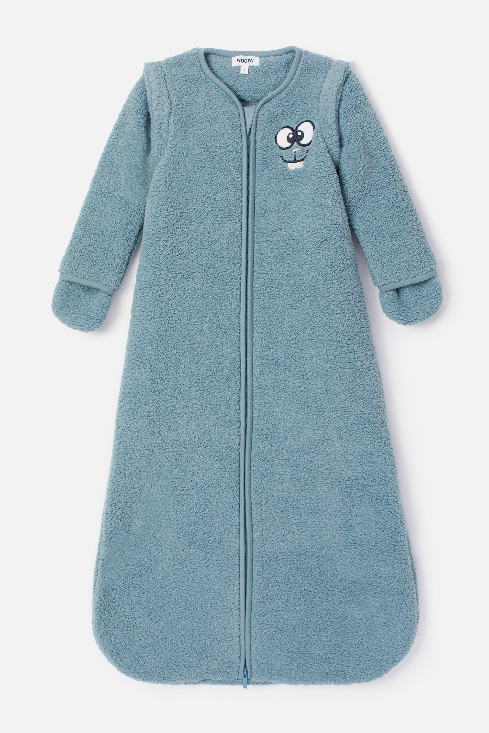 Een mooie slaapzak van Woody, met rits en afneembare mouwen, in zachte en warme fleece. Voor een knusse nachtrust.